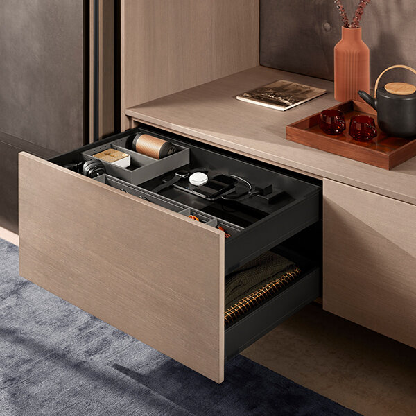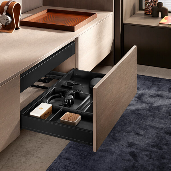 AMPEROS AC kan perfect worden gecombineerd met BLUMOTION, TIP-ON BLUMOTION en SERVO-DRIVE en kan eenvoudig in de ladesystemen MOVENTO en LEGRABOX worden geïntegreerd.