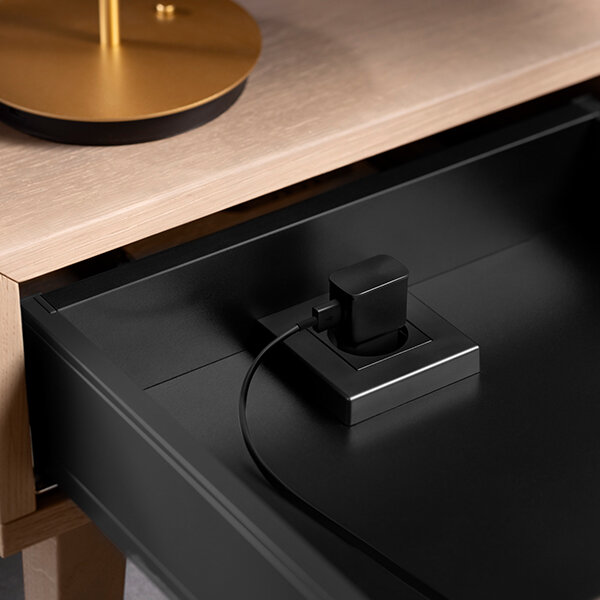 Dankzij het stopcontact in de lade kunt u elk apparaat eenvoudig gebruiken. Zo blijven werkoppervlakken vrij en de gebruikelijke wirwar van kabels behoort tot het verleden.