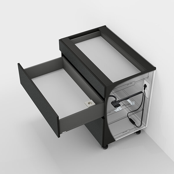 Dankzij het stopcontact in de lade kunt u elk apparaat eenvoudig gebruiken. Zo blijven werkoppervlakken vrij en de gebruikelijke wirwar van kabels behoort tot het verleden.