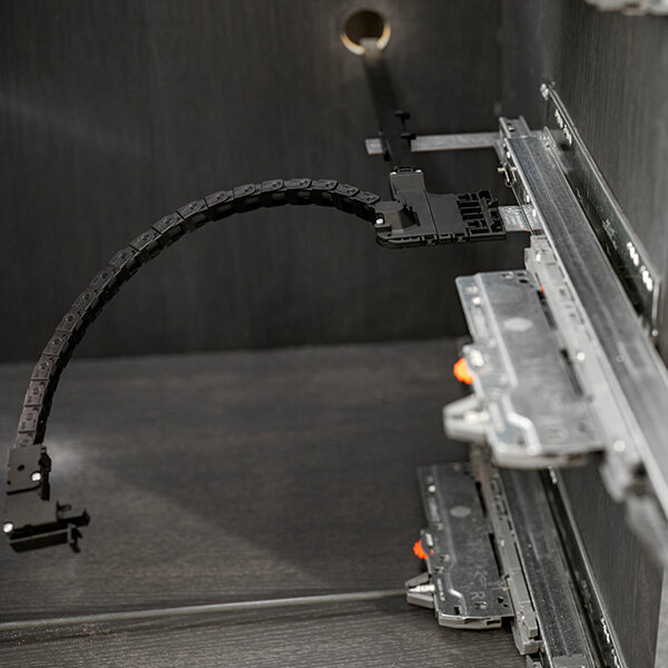 Voor het installeren van de kabelgeleider is geen gereedschap nodig, u sluit hem gewoon aan met de TIP-ON BLUMOTION eenheid.