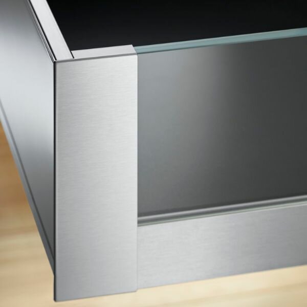 Blum LEGRABOX binnenlade met glazen front, inbouwhoogte van 106 mm.