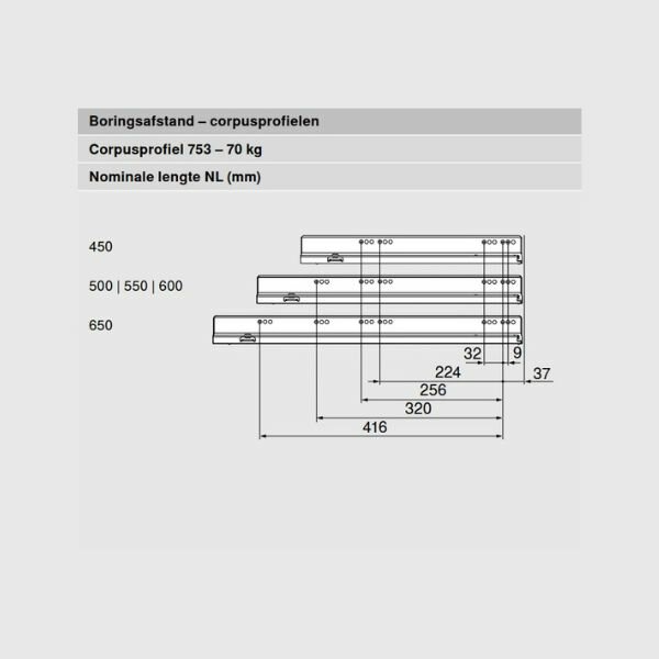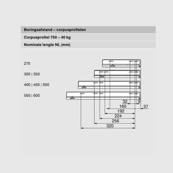 Daar de LEGRABOX lades voor verschillende doeleinden geschikt zijn, is er ook een verschil in het te kiezen draagvermogen. Lades voor handdoeken in de badkamer hebben vaak genoeg aan een draagvermogen van 40 kg, maar een lade van 120 cm breed vol met borden en schalen heeft al snel een draagvermogen nodig van 70 kg. Maak de keuze van het draagvermogen dus op basis van de breedte van de lade en het gebruik van de lade.