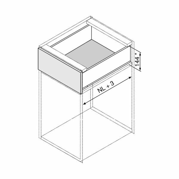 Blum LEGRABOX keukenlade met TIP-ON en BLUMOTION, inbouwhoogte van 144 mm.