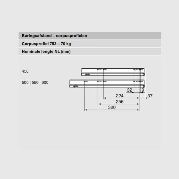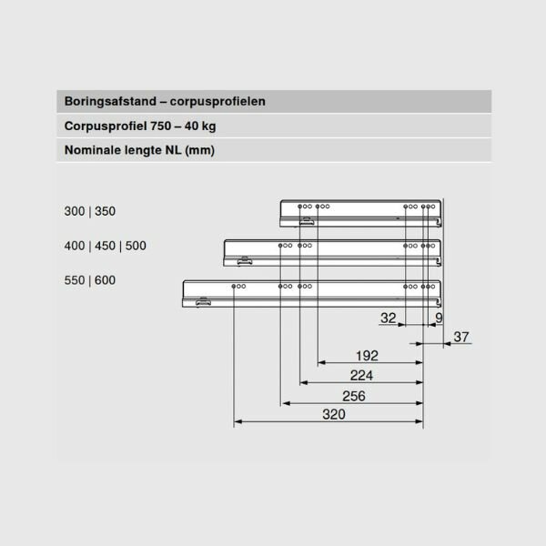Daar de LEGRABOX lades voor verschillende doeleinden geschikt zijn, is er ook een verschil in het te kiezen draagvermogen. Lades voor handdoeken in de badkamer hebben vaak genoeg aan een draagvermogen van 40 kg, maar een lade van 120 cm breed vol met borden en schalen heeft al snel een draagvermogen nodig van 70 kg. Maak de keuze van het draagvermogen dus op basis van de breedte van de lade en het gebruik van de lade.