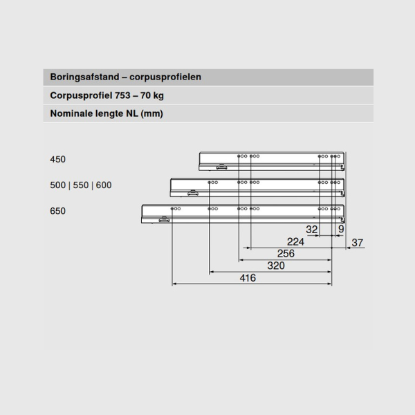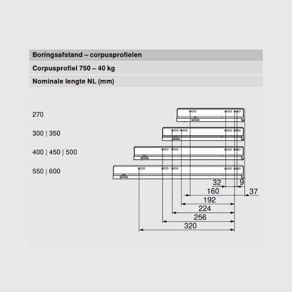 Daar de LEGRABOX lades voor verschillende doeleinden geschikt zijn, is er ook een verschil in het te kiezen draagvermogen. Lades voor handdoeken in de badkamer hebben vaak genoeg aan een draagvermogen van 40 kg, maar een lade van 120 cm breed vol met borden en schalen heeft al snel een draagvermogen nodig van 70 kg. Maak de keuze van het draagvermogen dus op basis van de breedte van de lade en het gebruik van de lade.